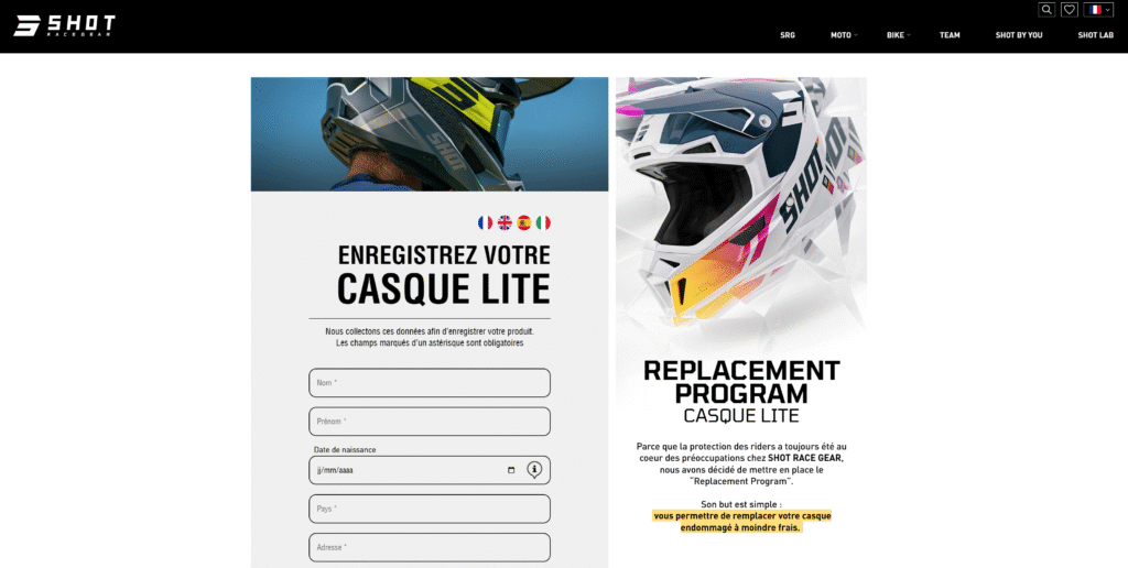- Enregistrer le casque sur le site officiel via “product-activation” Shot Race Gear
