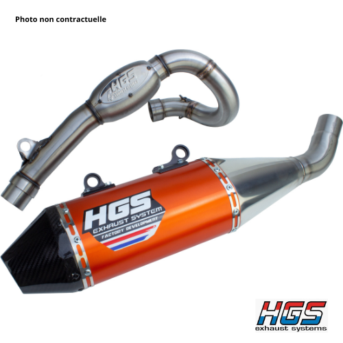 Ligne HGS orange embout carbone pour 250 SX-F / FC / MC. Look factory, gain de couple, sonorité racing, perf GP validée !