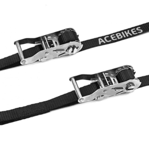 Set de 2 sangles à cliquet ACEBIKES avec boucles guidon et sac. Fixation rapide et fiable pour transporter ta moto en toute sécurité.